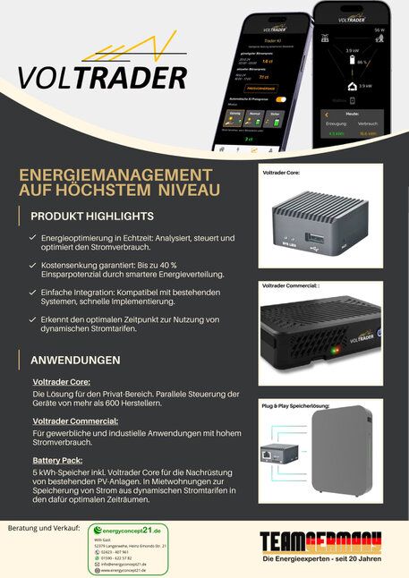 DAS KANN DIE VOLTRADER BATTERY: Die KI-Steuerung überwacht die Preise der Strombörse und macht intelligenten Stromeinkauf für alle verfügbar. Auch ohne PV-Anlage belädt sich der Speicher dadurch mit dem günstigsten und saubersten Strom.Ihre Wallbox, Wärmepumpe, Heizstab, Smarte Steckdose etc. wird auch integriert und smart gesteuert (z.B. E-Auto laden bei negativen Strompreisen)